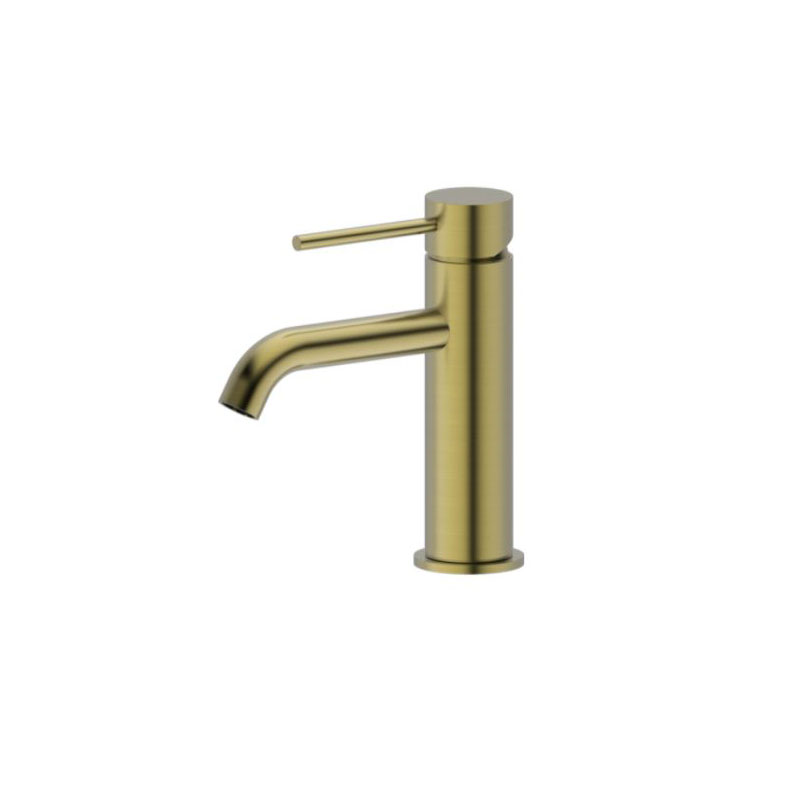 Brushed Gold Pin Lever Basin Mixer Curved Spout Solid Brass Construction Stylish Contemporary Design Splash Reducing Neoperl Aerator