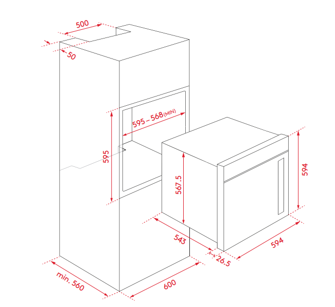 IOSO605M-L Left Hand Hinged 67L Capacity 5 Functions Side Opening Doors Triple Glazed Cool Touch Doors Minute Minder Timer Black Glass Door Removable Chrome Side Racks